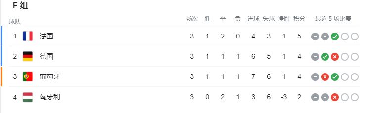 今天晚上看了欧洲杯葡萄牙vs法国,非常的好看。由于这一组之前的战况比较胶着,任何一支队伍都有可能出线。这场比赛是和同组的另一场比赛德国vs匈牙利同时进行的,两场比赛的比分变化实时影响着整组的排名。两场比赛的最终比分都是2:2。这边是葡萄牙先进一个点球,同样是在上半场法国也创造并打进一个点球,把比分扳平;下半场法国现在运动战中进球,然后葡萄牙通过C罗制造的点球再次扳平比分。这个比分也一直延续到比赛结束。另一边德国vs匈牙利的比分变化也很剧烈:0-1,1-1,1-2,2-2。匈牙利虽然一直领先但是在84分钟的时候被德国队扳平,最后失去了出线的机会。葡萄牙的小组排名也在比赛的过程中像坐过山车一样。从小组第一到小组第二,再到小组第四,又回到小组第一,再到小组第二,最后定格在小组第三。这场比赛是真的刺激。