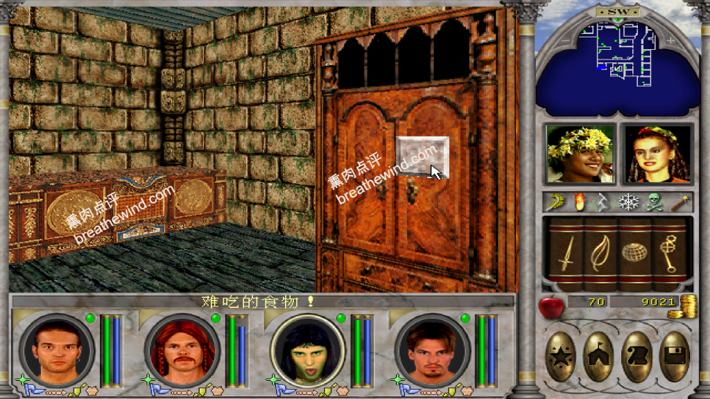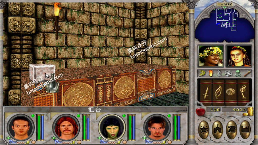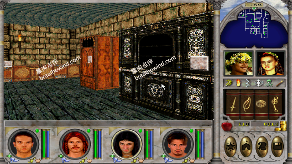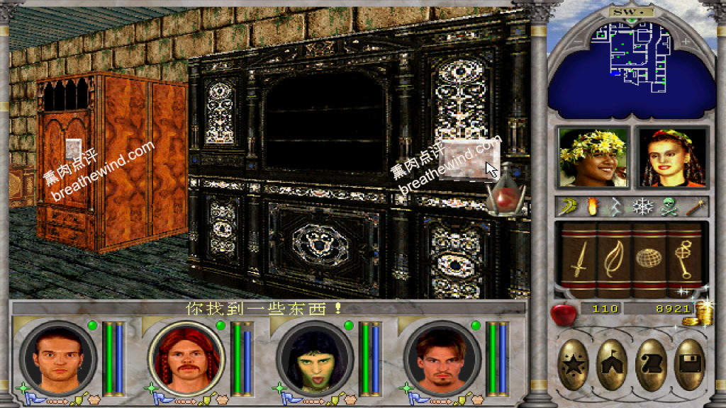 - 在New World Computing 中有很多的装备和金币,建议开着魔力神眼探索。除了地上的金币与装备以外,点击有些柜子和书架上也可以拿到装备,如上图(图10)女性NPC身后的矮柜,和下图(图11)的书架,都可以多次点击得到装备。我在书架上拿到了一本地狱烈焰,据说如果没拿到,可以通过SL大法反复刷。